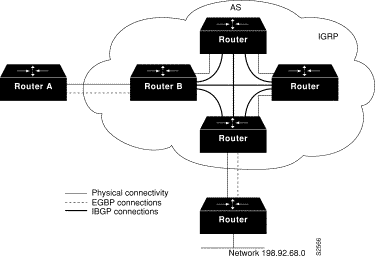 In the configuration shown in Figure 29, with synchronization on, Router B does not advertise network 198.92.68.0 to Router A until an IGRP route for network 198.92.68.0 exists. If you specify the no synchronization router configuration command, Router B advertises network 198.92.68.0 as soon as possible. However, because routing information still must be sent to interior peers, you must configure a full internal BGP mesh.